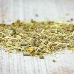 Lijnzaaddoppen, sojavoer (geproduceerd met genetisch gemodificeerde soja), luzerne, aardappeleiwit, tarwevoermeel, teff, timothee hooi, luzernestengels, bietenmelasse, tarwezemelen, paardenbonenvlokken, wortelstukjes, fenegriek en calciumcarbonaat.