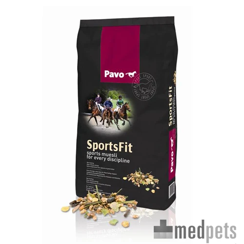 Pavo SportsFit is de ideale energiebron voor een sportpaard. Het is een hoogwaardige, olierijke sportmuesli voor paarden die gemiddelde tot hoge inspanning leveren (energy level medium). Pavo SportsFit is een volledig krachtvoer en kan bij alle disciplines worden ingezet voor een optimale sportprestatie. Omega 3- en 6-vetzuren zijn als energiebron geschikt voor langdurige en zware arbeid. Bij de verbranding van omega 3- en 6-vetzuren komen er geen afvalstoffen vrij in de spieren. Uit onderzoek blijkt dat deze vetzuren bijdragen aan een mooie vacht en aan het onderdrukken van ontstekingsreacties in de gewrichten. De vezels uit lijnzaad ondersteunen het darmmilieu en zijn daarom tevens geschikt voor paarden die last van de darmen hebben.