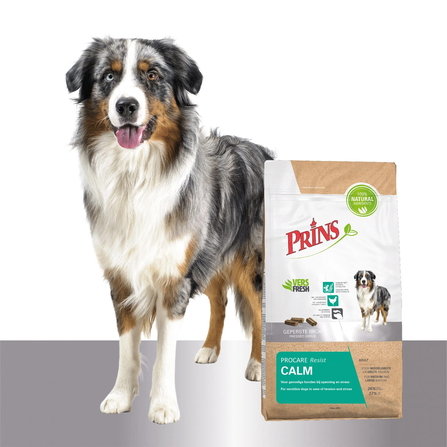 Prins ProCare Resist Calm is een speciaal samengestelde droogvoeding van geperste brokken. Deze voeding met kruidenextracten is geschikt voor volwassen honden vanaf 1 jaar met een verminderde weerstand. Honden kunnen een verminderde weerstand krijgen bij ziekte of herstel na een operatie, door spanningen of hormonale schommelingen. ProCare Resist Calm van Prins bevat gehydrolyseerd melkeiwit en tryptofaan, die bijdraagt aan het evenwichtig houden van uw hond in spannende situaties. Daarnaast zijn er ook kruidenextracten toegevoegd die een rustgevend gevoel geven. ProCare Resist Calm is rijk aan vitaminen en mineralen, waaronder vitamine C en D, zink en selenium die het immuunsysteem ondersteunen.