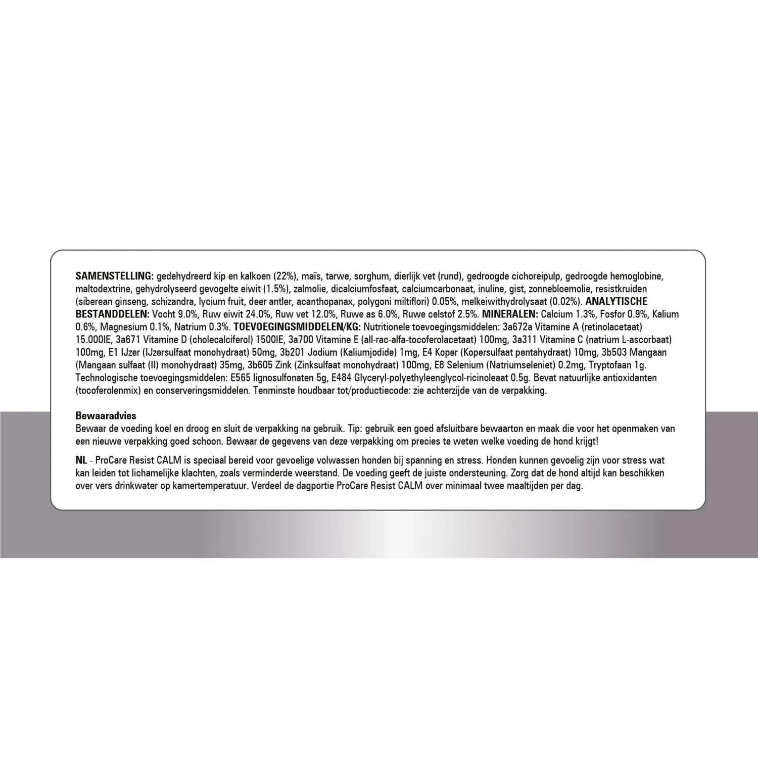 gedehydreerde kip en kalkoen (22%), maïs, tarwe, sorghum, dierlijk vet (rund), gedroogde cichoreipulp, hemoglobine, maltodextrine, gehydrolyseerd gevogelte eiwit (1.5%), zalmolie, dicalciumfosfaat, calciumcarbonaat, inuline, gist, zonnebloemolie, resistkruiden (siberean ginseng, schizandra, lycium fruit, deer antler, acanthopanax, polygoni multiflori) 0.05%, melkeiwithydrolysaat (0.02%).