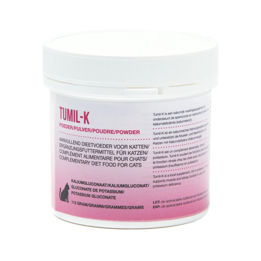 Tumil-K is een aanvullend dieetvoeder voor katten met chronisch nierfalen of andere aandoeningen waardoor katten een laag kaliumgehalte in het bloed kunnen krijgen. Het dieetvoeder is een kaliumhoudend product in poedervorm. Tumil-K bestaat uit een smakelijke eiwitbasis en zal daardoor makkelijker door katten worden opgenomen.